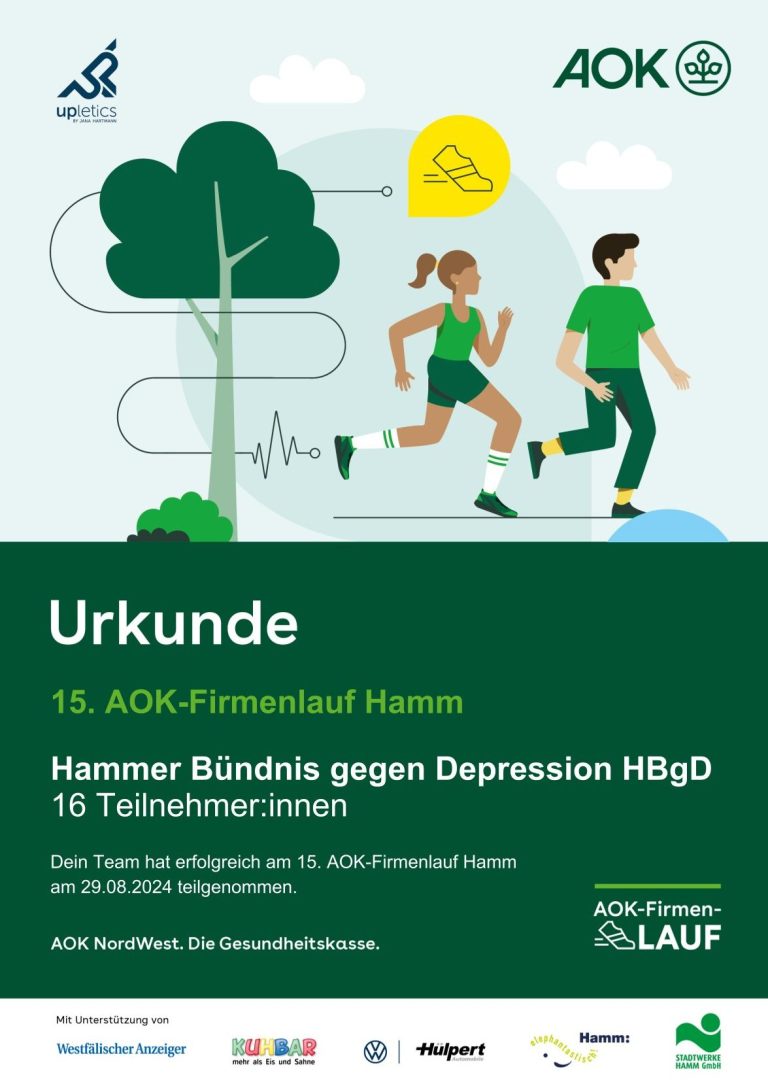 Am Donnerstag, 4.9.2025 nahm unser „Bündnis gegen Depression“ mit 8 Mitgliedern erfolgreich am AOK-Firmenlauf in Hamm teil.